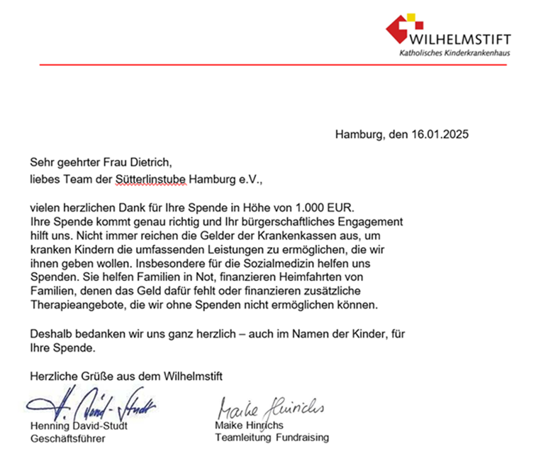 Ebenso im November 2024 konnten wir 1000,-€ an das Hamburger Kinderkrankenhaus Wilhelmstift spenden: