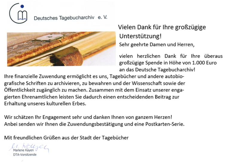 Im Dezember 2024 spendeten wir 1000,-€ an das Deutsche Tagebucharchiv e.V.: