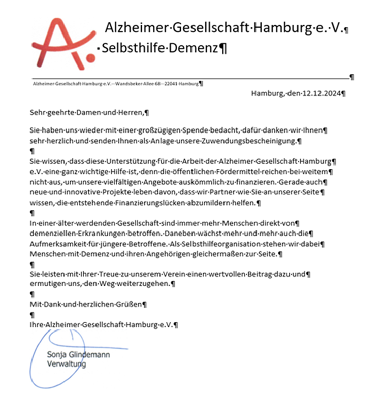 Im November 2024 konnten wir 5000,-€ an die Alzheimer Gesellschaft Hamburg e.V. spenden, hier der Dankesbrief dazu: